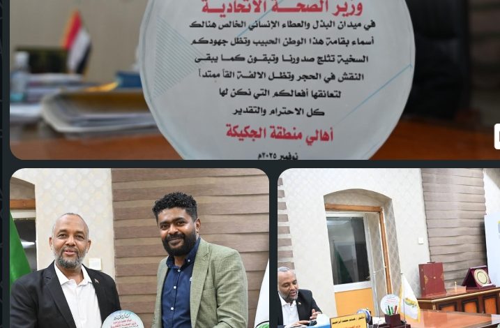تلقى وزير الصحة الاتحادي بروفسير هيثم محمد إبراهيم إهداء من أهالي منطقة الجكيكة بولاية نهر النيل، تعبيراً عن تقديرهم لجهوده في خدمة المنطقة. ويأتي هذا التكريم بعد أن أعاد الوزير تشغيل المستشفى الرئيسي الذي ظل متوقفاً عن العمل لفترة طويلة، ليصبح واحداً من أكبر مستشفيات الطوارئ والإصابات في السودان، مقدماً خدماته الصحية للمواطنين في مختلف أنحاء البلاد. وقد كان للمستشفى دور بارز خلال معركة الكرامة، حيث ساهم في إنقاذ العديد من الأرواح. قام بتسليم الإهداء للوزير الدكتور عماد عبد المنعم الخير الطيب، مدير إدارة المستشفيات بوزارة الصحة الإتحادية والمدير السابق لمستشفى الجكيكة.