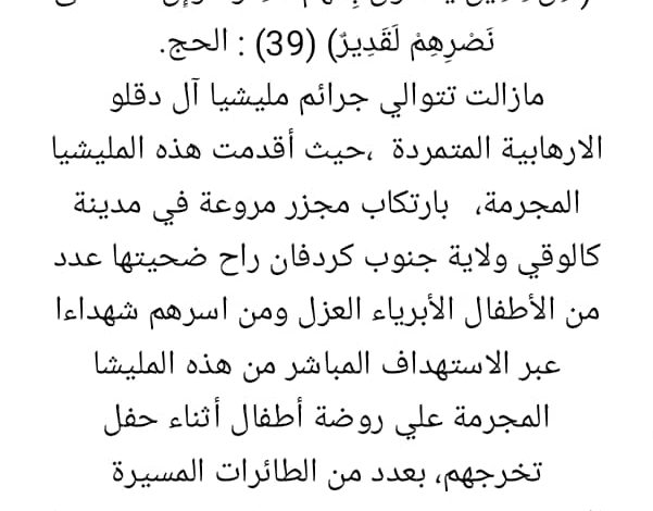 مازالت تتوالي جرائم مليشيا آل دقلو الارهابية المتمردة ،حيث أقدمت هذه المليشيا المجرمة، بارتكاب مجزر مروعة في مدينة كالوقي ولاية جنوب كردفان راح ضحيتها عدد من الأطفال الأبرياء العزل ومن اسرهم شهداءا عبر الاستهداف المباشر من هذه المليشا المجرمة علي روضة أطفال أثناء حفل تخرجهم، بعدد من الطائرات المسيرة الاستراتيجية، حيث بلغ عدد القتلي 57 شهيدا والجرحي 48 جريحا .