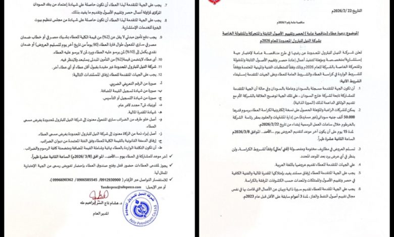 تعلن شـركـة النيل للبترول المحـدودة عن رغبتها في طرح مناقصـة عـامـة لإختيار جهـة إسـتشـارية/متخصصـة ومؤهلة لتنفيذأعمال إعادة حصـر وتقيم الأصـول الثابتة والمنقولة و المتحركة الخاصة بالشـركة للعام 2026)م وذلك وفقاً للمتطلبات الفنية والمهنية المعتمدة ووفقاً للشـروط الواردة في كراسـة العطاء والشـروط العامة للعطاء وعلى الجهة المتقدمة إستيفاء